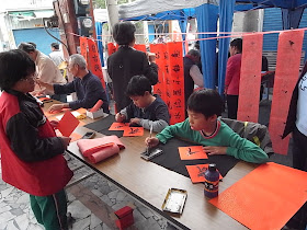 | 大師帶著學生揮毫贈春聯,添年味,也是文化傳承。(攝影/李孟霖) |
